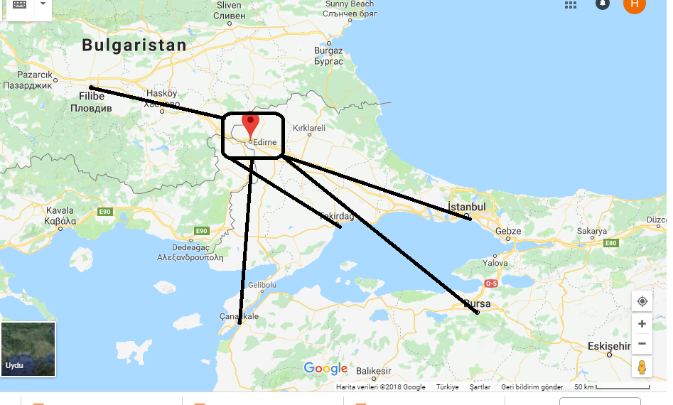 Kendi özel aracınızla Türkiye’nin her noktasından Edirne’ye çok rahat bir şekilde ulaşım sağlayabilirsiniz. Edirne ile bazı şehirler arası mesafe şöyledir;