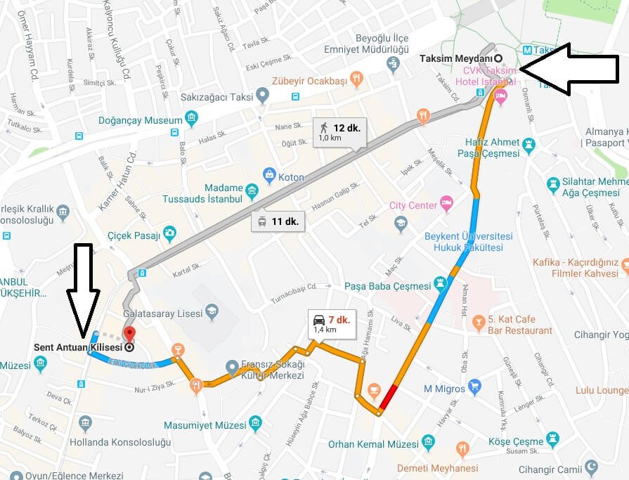 Sent Antuan Kilisesine gitmek gerçekten ulaşım anlamında çok kolaydır. İstanbul’da hemen bir çok ulaşım ağının ortak noktası olan İstiklal caddesi ve Taksim civarına geldiğinizde buradan yürüyerek varabilirsiniz.