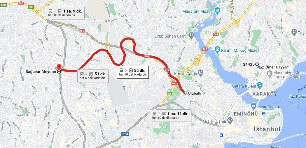 Taksim meydanından Bağcılar ilçe meydanına nasıl giderim? Yaklaşık olarak 1 saatten fazla sürecek olan bu yolculuğunuz tahmini 7 liranın üzerinde mal olacaktır.